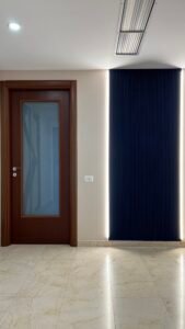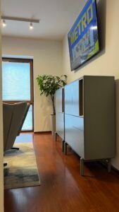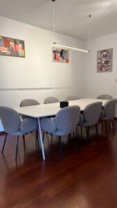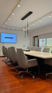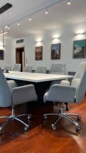 La intrare, identitatea vizuală a companiei este evidențiată prin integrarea logo-ului în frontul de mobilier existent, devenind un element discret, dar reprezentativ pentru brand. Cele două săli de ședințe - sala principală, destinată întâlnirilor cu clienții și potențialii colaboratori, și sala secundară, dedicată echipei interne - pot fi accesate atât independent, cât și printr-un traseu comun care le conectează. Amenajarea acestora este una curată și funcțională, fără elemente decorative sau finisaje inutile, punând accent pe piese de mobilier de calitate, care transmit rafinament, profesionalism și seriozitate.