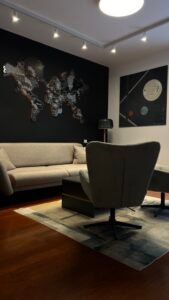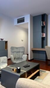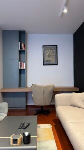 Amplasat într-o clădire de locuințe, spațiul beneficiază de o configurație specifică apartamentelor moderniste, cu o planimetrie eficientă, în care estetica rezultă din echilibrul dintre formă, funcție și lumină naturală.