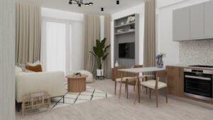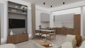 În partea opusă se află livingul open space, unde peretele media devine elementul central al amenajării, atât prin configurația mobilierului, cât și prin paleta cromatică și jocul de texturi alese. Canapeaua, confortabilă și bine proporționată, este amplasată strategic pentru a oferi o perspectivă amplă asupra întregului apartament.