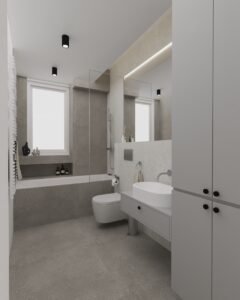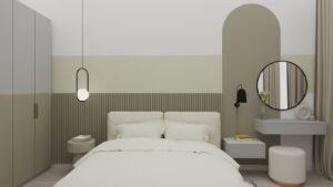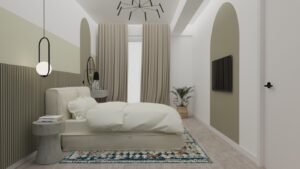 Apartamentul include și un dormitor spațios, configurat astfel încât să integreze atât zone generoase de depozitare, cât și un colț dedicat lucrului sau utilizat ca măsuță de make-up. În contrast cu sobrietatea proiectului Otopeni One, această amenajare se remarcă prin accente cromatice curajoase, prezente atât la nivelul finisajelor pereților, cât și în designul pieselor de mobilier, adăugând personalitate și dinamism spațiului.