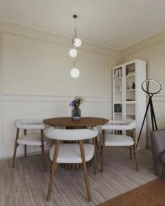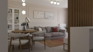 Paleta cromatică variată este echilibrată cu grijă, iar zona de living transmite o stare de liniște și calm, susținută de nuanțele atent alese pentru finisajele pereților. Profilele decorative adaugă profunzime spațiului și, prin poziționarea lor strategică, contribuie la lărgirea și înălțarea percepției volumului. Deși are o suprafață relativ restrânsă, livingul integrează armonios și zona de luat masa, în timp ce, pe latura opusă, se află bucătăria.