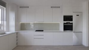 Bucătăria este tratată într-o cromatică neutră, discretă, care o integrează firesc în ansamblu, fără a domina vizual spațiul. În schimb, funcționalitatea acesteia devine elementul definitoriu al zonei.